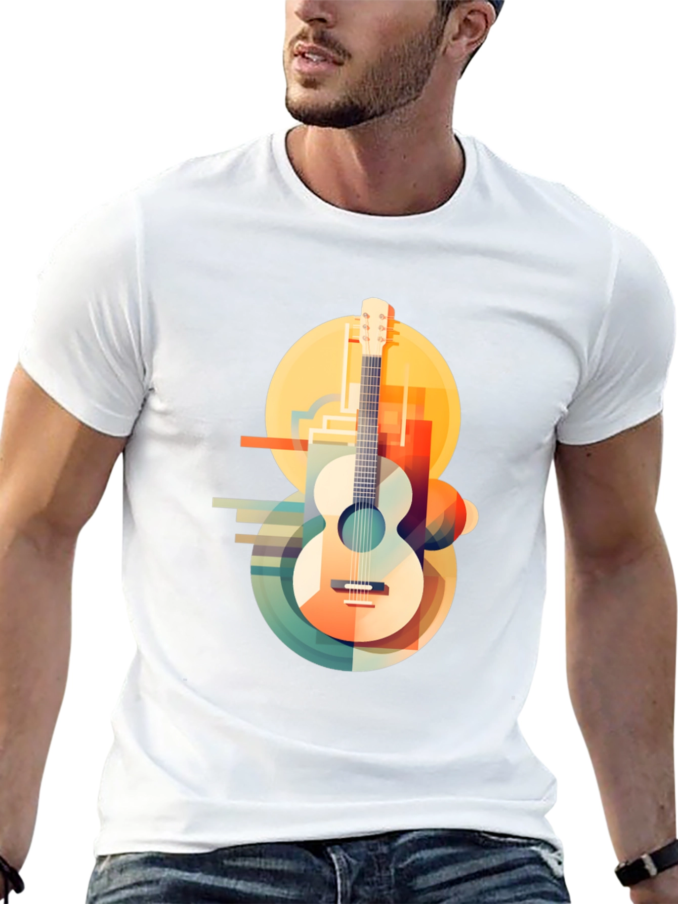 Showcase your love for music with this unique graphic tee. The shirt features a vibrant, abstract guitar design with geometric shapes and a retro color palette. Made from a comfortable black fabric, this tee is perfect for casual wear, music events, or as a standout piece in your everyday wardrobe. The bold graphic print ensures you'll turn heads wherever you go. Ideal for musicians, art lovers, or anyone with a creative spirit. Add this statement piece to your collection and let your passion shine through.