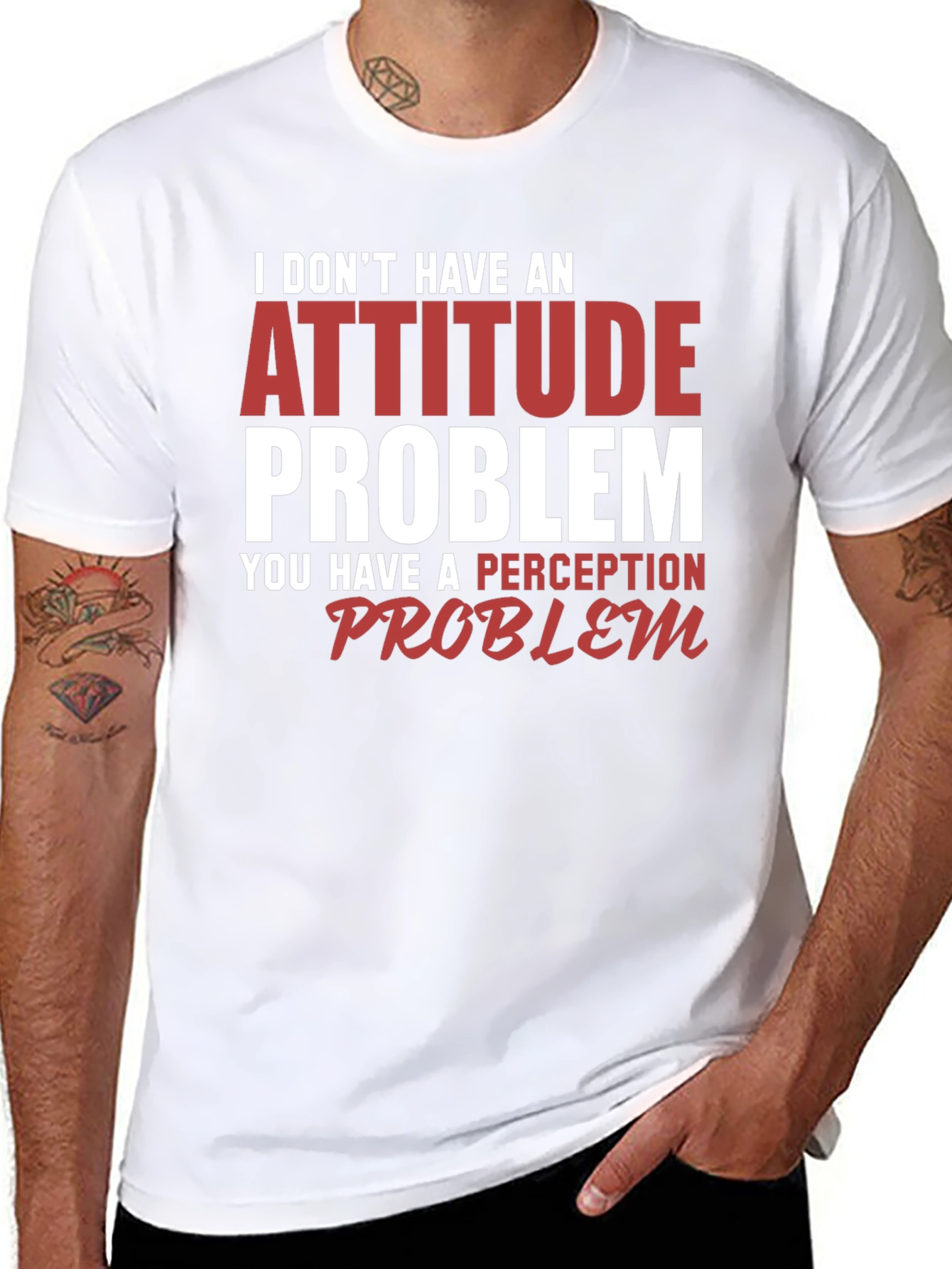 Make a statement with this bold black t-shirt featuring a humorous slogan. The shirt reads, "I DON'T HAVE AN ATTITUDE PROBLEM. YOU HAVE A PERCEPTION PROBLEM" in a mix of red and white block lettering, ensuring the message stands out. Crafted from what appears to be a soft and comfortable cotton blend, this tee offers both style and comfort. Perfect for casual wear, social gatherings, or as a conversation starter, this tee will add a touch of irreverent humor to your wardrobe. Show off your unique personality with this eye-catching graphic tee. It also makes a fun and memorable gift!