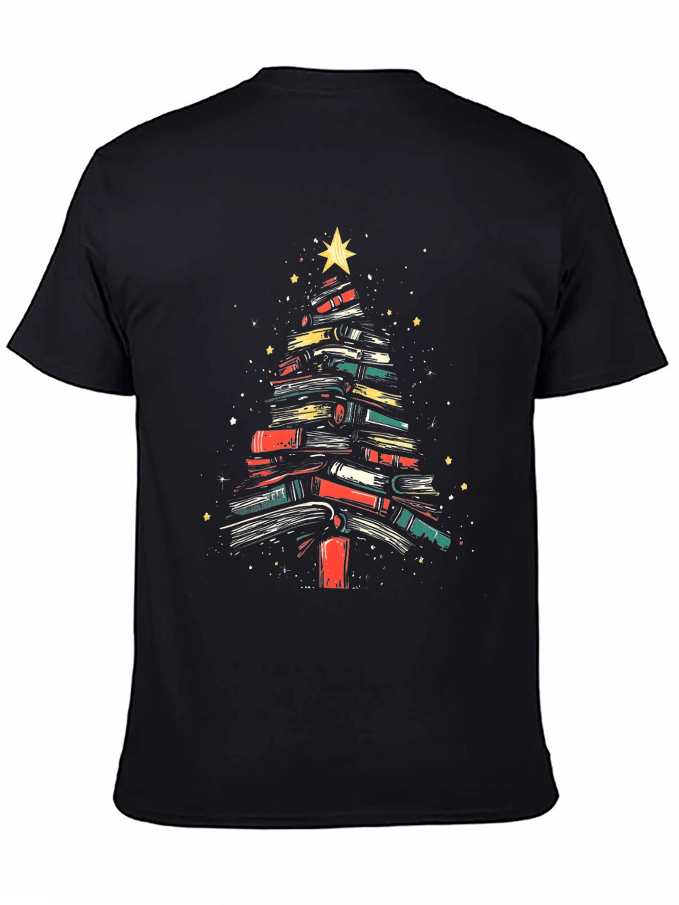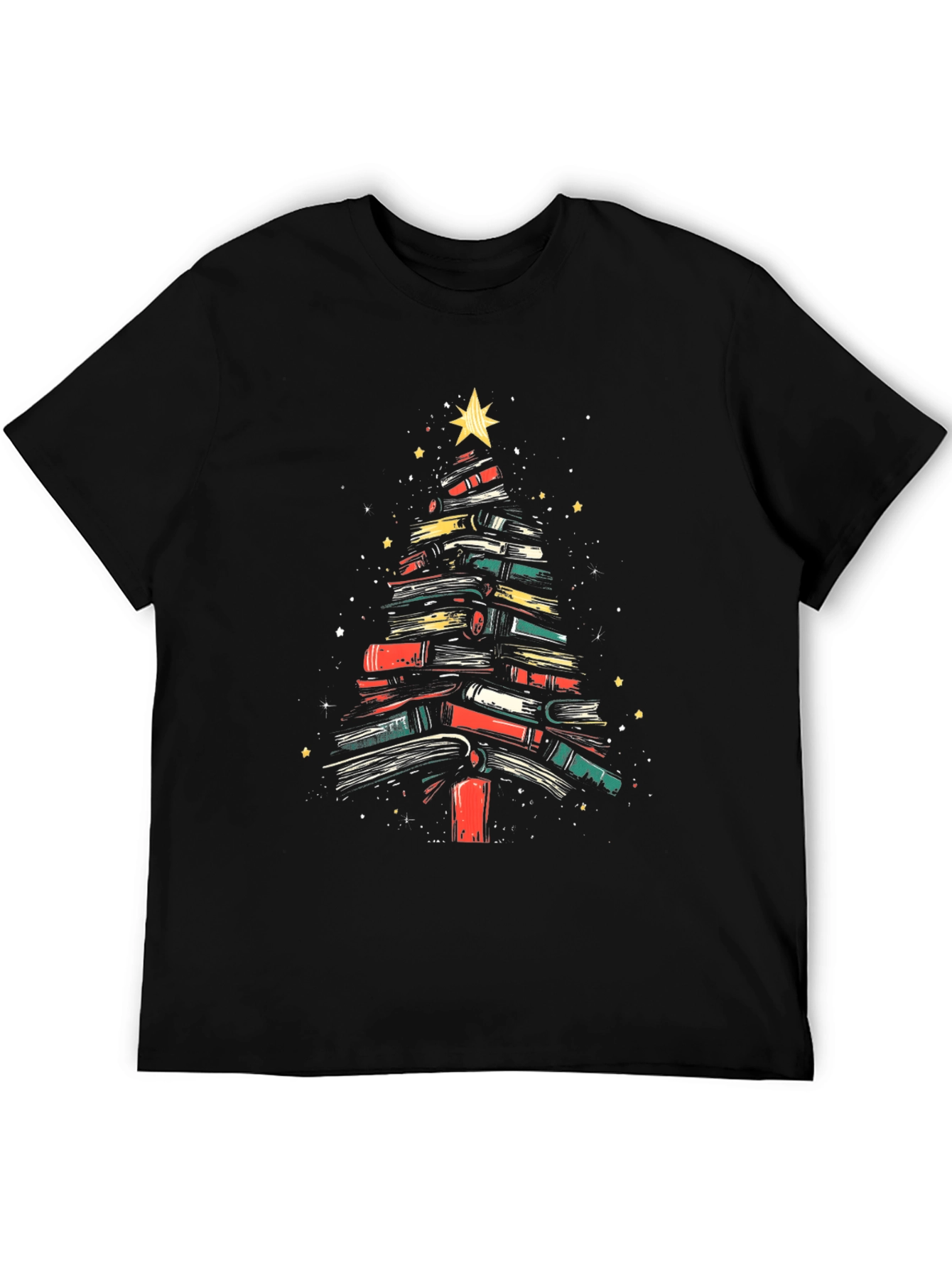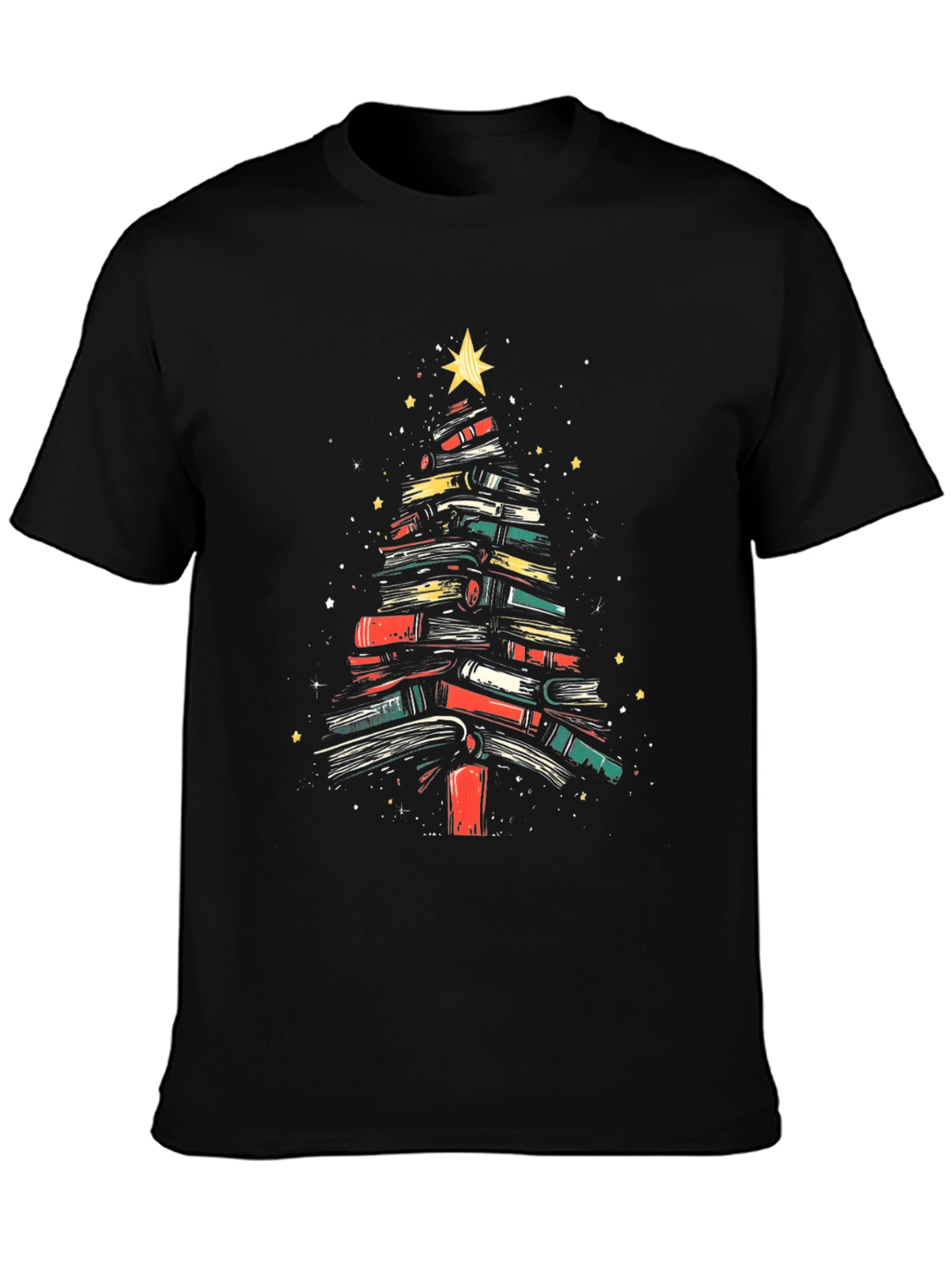 Celebrate the holidays with this unique and stylish black t-shirt. The design features a creative "Christmas tree" made entirely of stacked books, topped with a shining gold star. The vibrant illustration brings a festive touch to your wardrobe, showcasing your love for reading and the holiday season. This soft and comfortable tee is perfect for book lovers, librarians, teachers, or anyone who enjoys a clever and literary twist on traditional holiday apparel. Wear it to your next holiday party, library event, or casual gathering. A thoughtful and fun gift for the bookworm in your life.