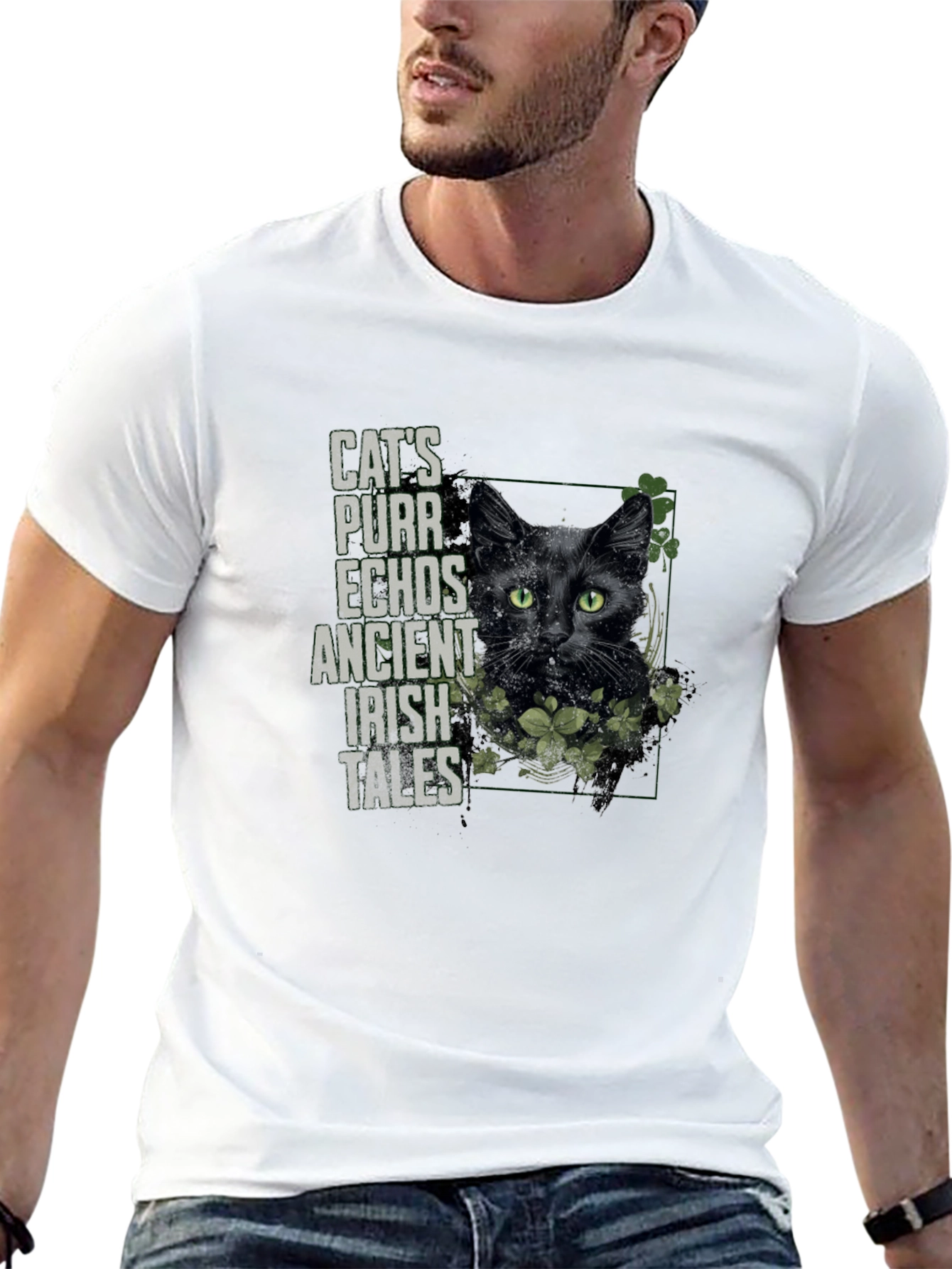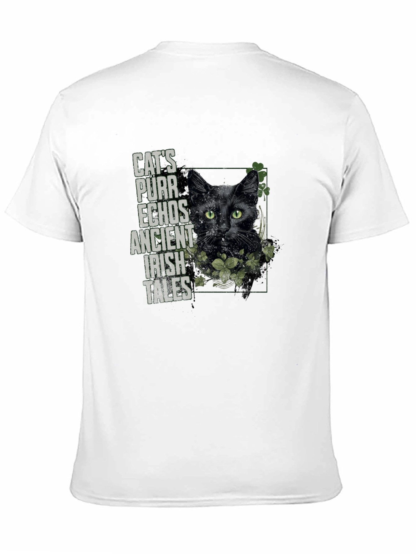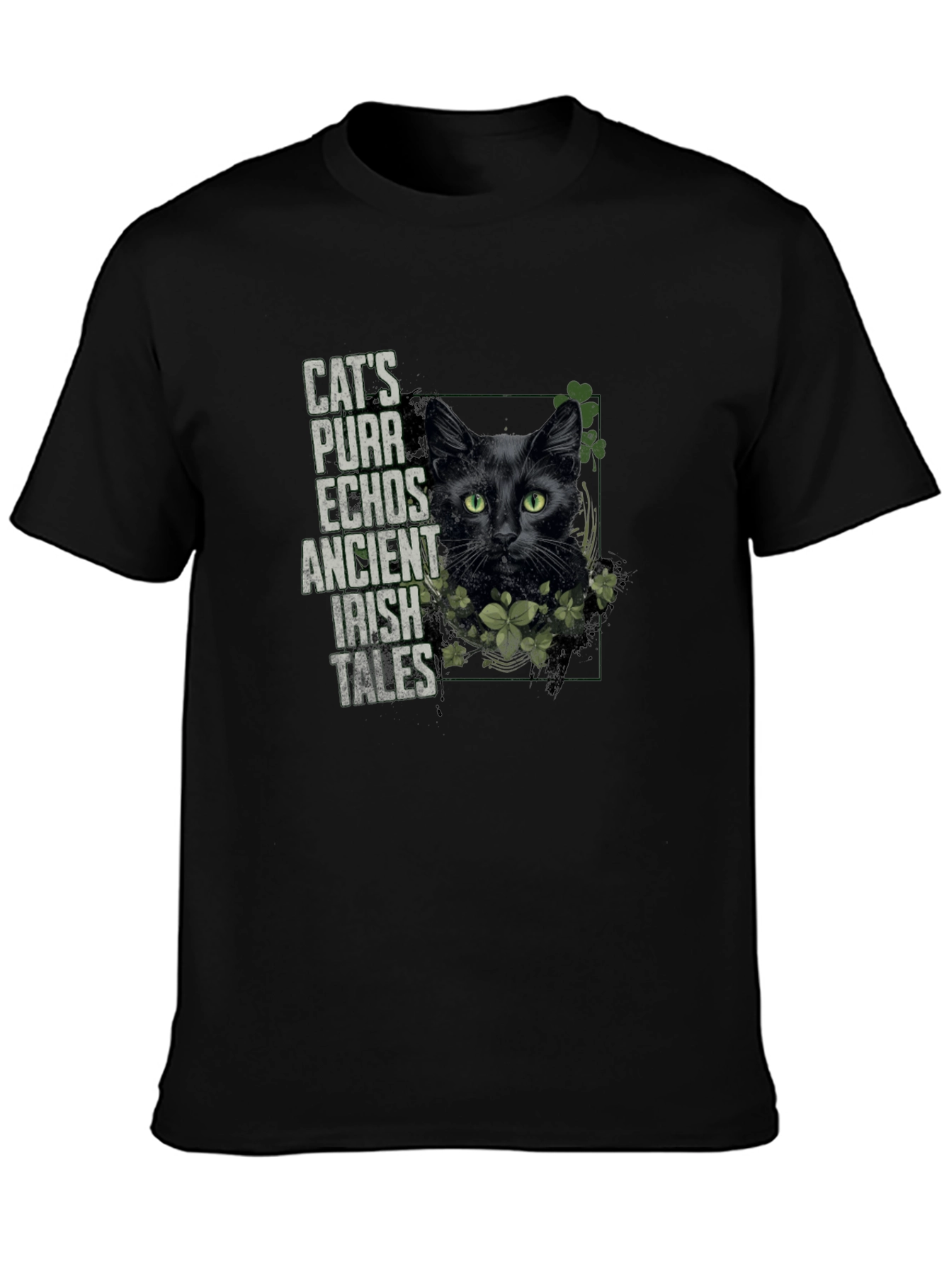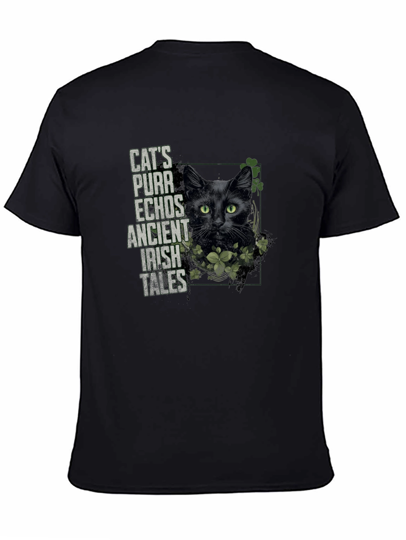 Embrace your love for cats and Irish folklore with this unique black t-shirt. The design features a striking image of a sleek black cat with mesmerizing green eyes, framed by shamrocks, the iconic symbol of Ireland. The text "Cat's Purr Echoes Ancient Irish Tales" adds a whimsical touch. Crafted from a comfortable fabric, this tee is ideal for casual wear, St. Patrick's Day celebrations, or as a conversation starter. The black backdrop ensures the graphic stands out, making it a stylish choice for cat lovers and those fascinated by Celtic traditions. A perfect blend of comfort, style, and heritage.