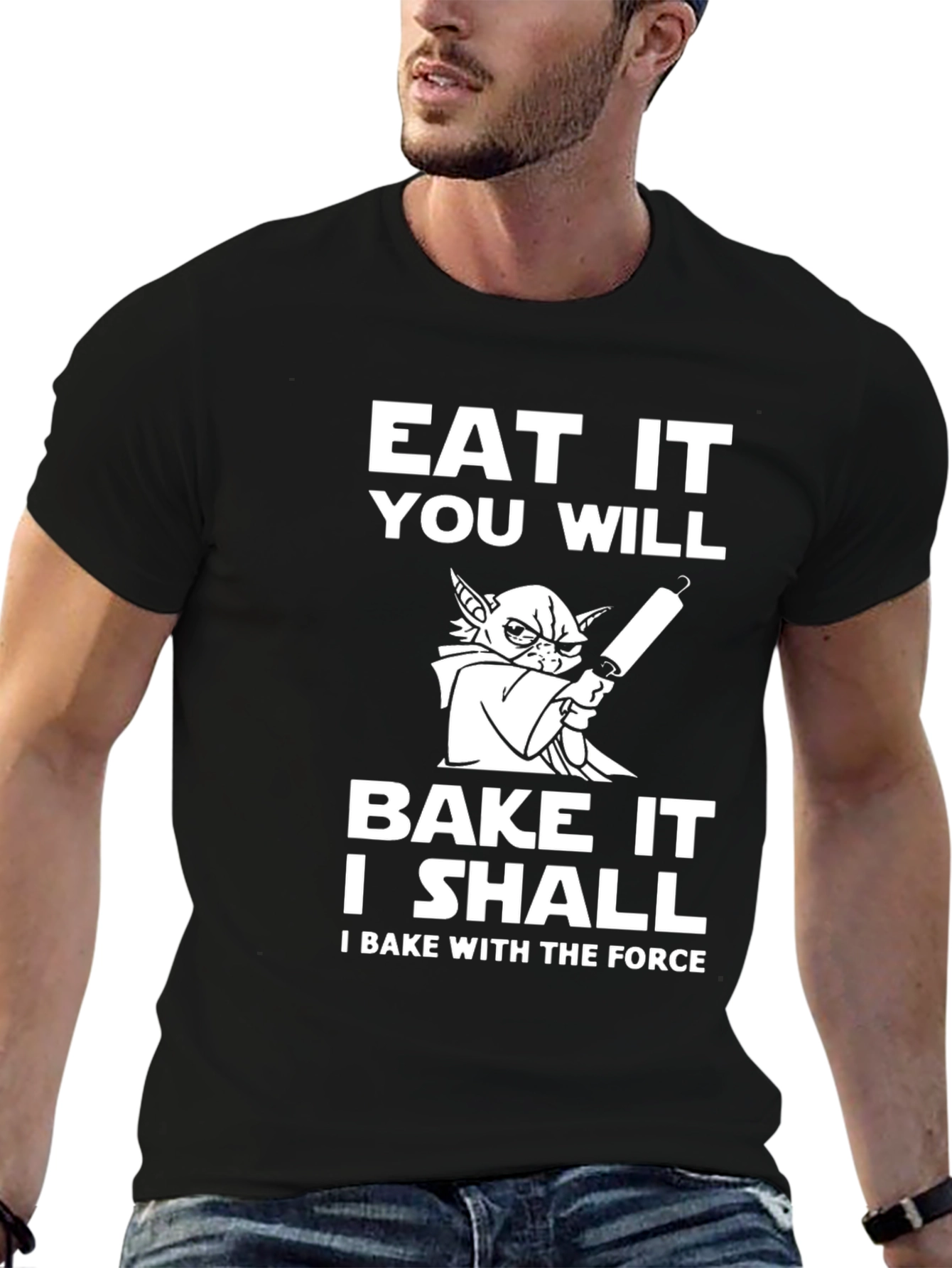 This black t-shirt features a fun design with Yoda wielding a rolling pin. Above him, the text reads "Eat It You Will," and below him, "Bake It I Shall, I Bake with the Force." Made from a soft-looking fabric, this tee offers both comfort and style. Ideal for Star Wars fans with a sense of humor, this shirt is great for everyday wear, casual outings, or as a gift for the baker in your life. Let everyone know you bake with the Force!