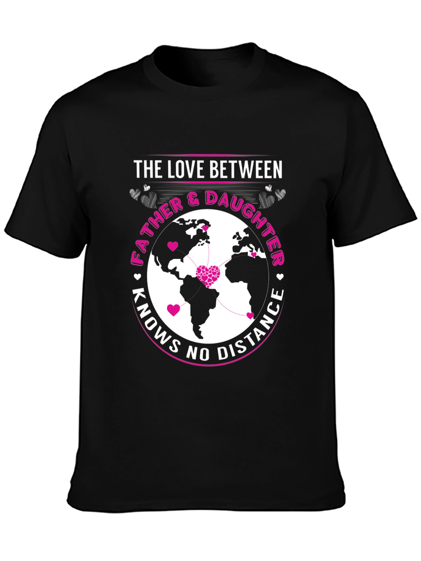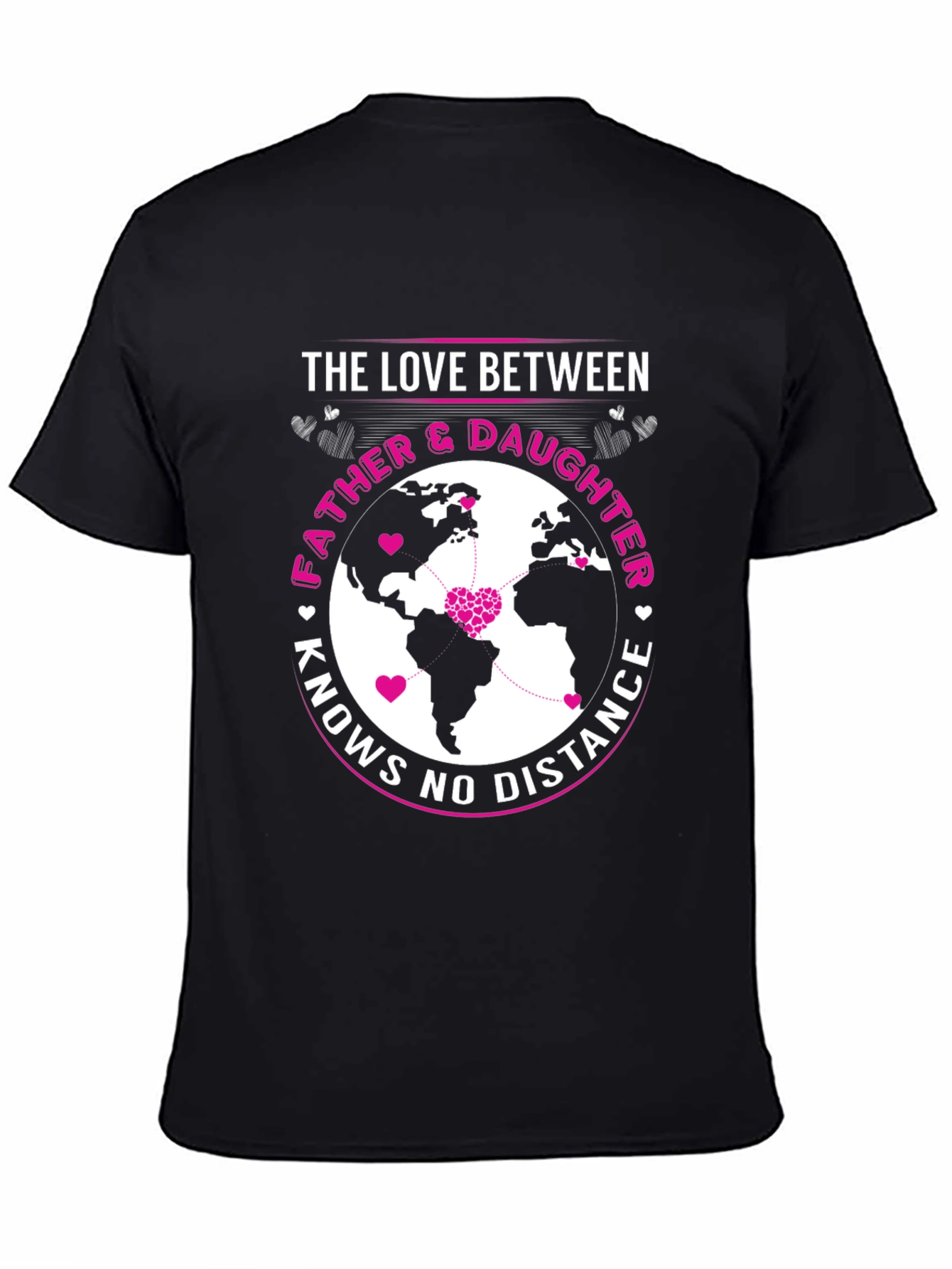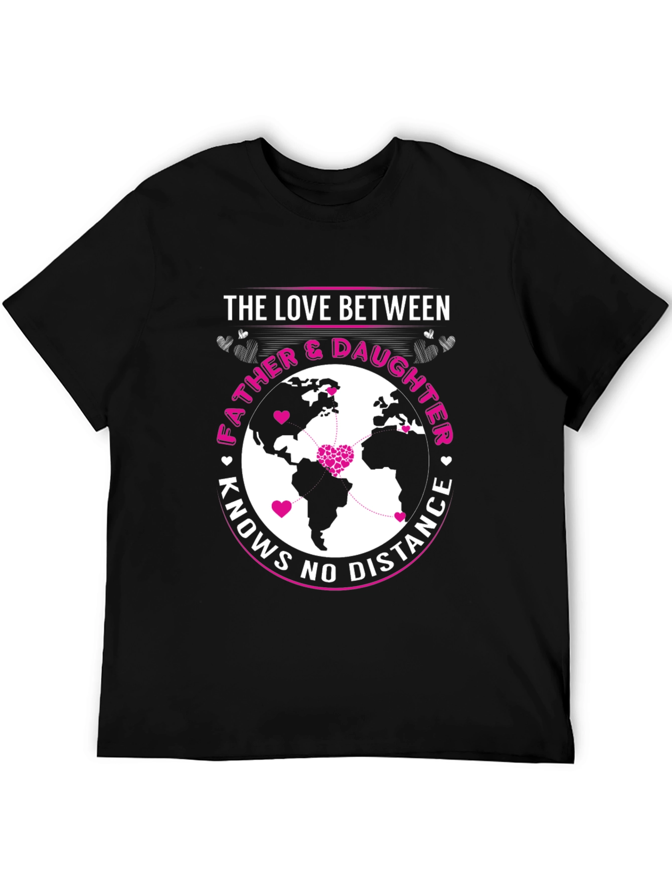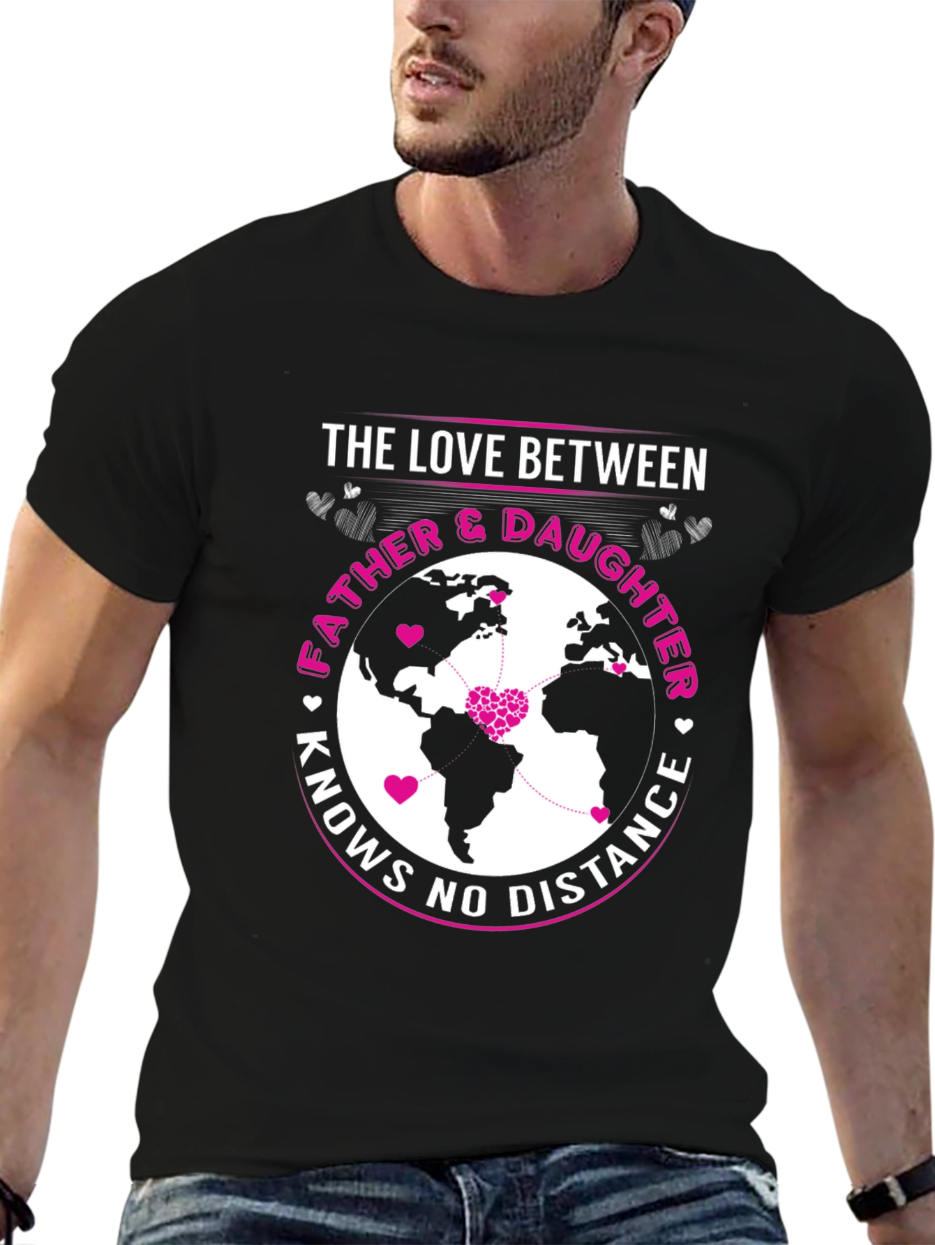 Show the world the special bond between a father and daughter with this stylish black t-shirt. The design features a globe graphic surrounded by pink hearts, highlighting the unbreakable connection across any distance. The phrase 'The love between Father & Daughter knows no distance' expresses the enduring affection. Made from a soft, comfortable fabric, this tee is perfect for casual wear. Whether it's a gift for Father's Day, a birthday, or just to show appreciation, this t-shirt is a meaningful way to celebrate the unique relationship. Wear your heart on your sleeve, or rather, on your chest!