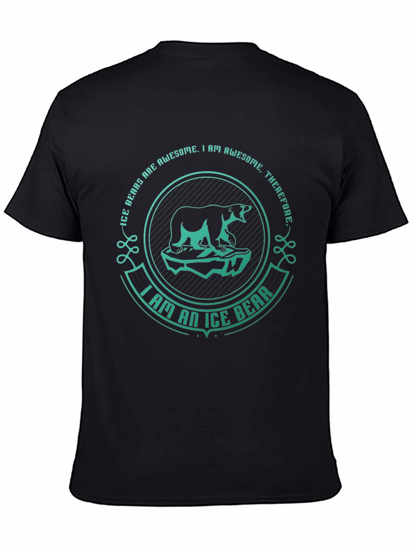 Show off your unique style with this eye-catching graphic tee! The shirt features a bold, circular graphic with a polar bear standing on an iceberg. The graphic includes the text "ICE BEARS ARE AWESOME. I AM AWESOME, THEREFORE, I AM AN ICE BEAR". This classic crew-neck t-shirt is made from soft, comfortable fabric, perfect for everyday wear. The black color makes it versatile and easy to pair with any outfit. Whether you're a fan of wildlife or just love quirky designs, this tee is a must-have addition to your wardrobe. Grab this conversation starter today!