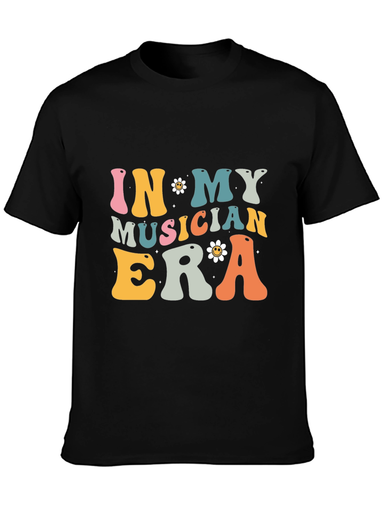 Rock your musical journey with this eye-catching black graphic tee! Featuring a playful, retro-inspired design with the words "IN MY MUSICIAN ERA" in vibrant, multi-colored lettering, this shirt is perfect for music lovers and aspiring artists alike. The soft fabric ensures all-day comfort, whether you're jamming with friends, hitting the stage, or just expressing your passion for music. Stand out from the crowd and let everyone know you're in your element with this trendy and expressive t-shirt. Get ready to make some noise!