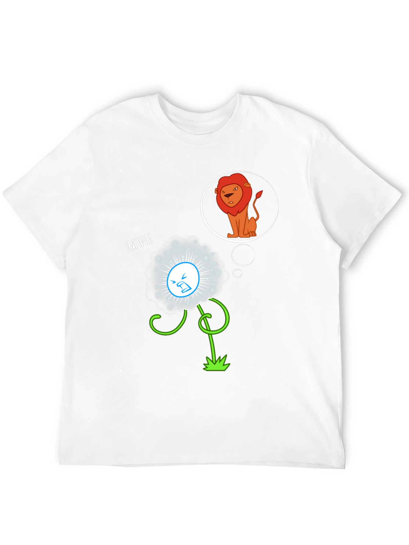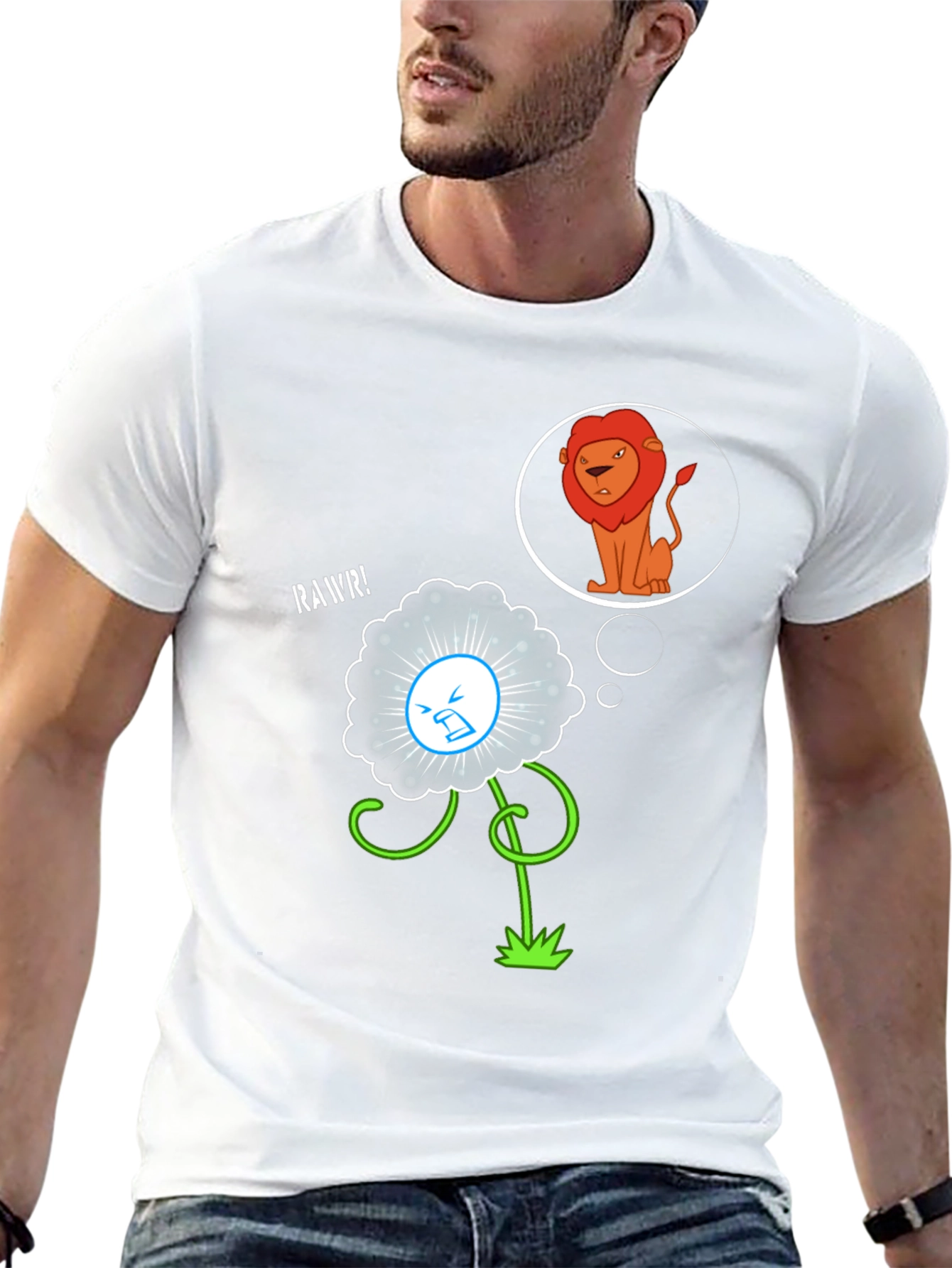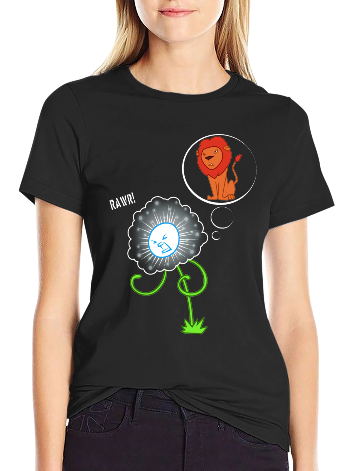 Roar into style with this unique black t-shirt! Featuring a playful design of a cute cartoon lion in a thought bubble above a peculiar angry cloud plant with 'RAWR!' text. The graphic is eye-catching and adds a fun, whimsical touch to your everyday wardrobe. Made from soft, comfortable fabric, this tee is perfect for casual wear. Show off your quirky personality and make a statement with this standout tee. Great for animal lovers and anyone who enjoys fun, unconventional designs. Stand out and spark conversations with this comfy and cool graphic tee.