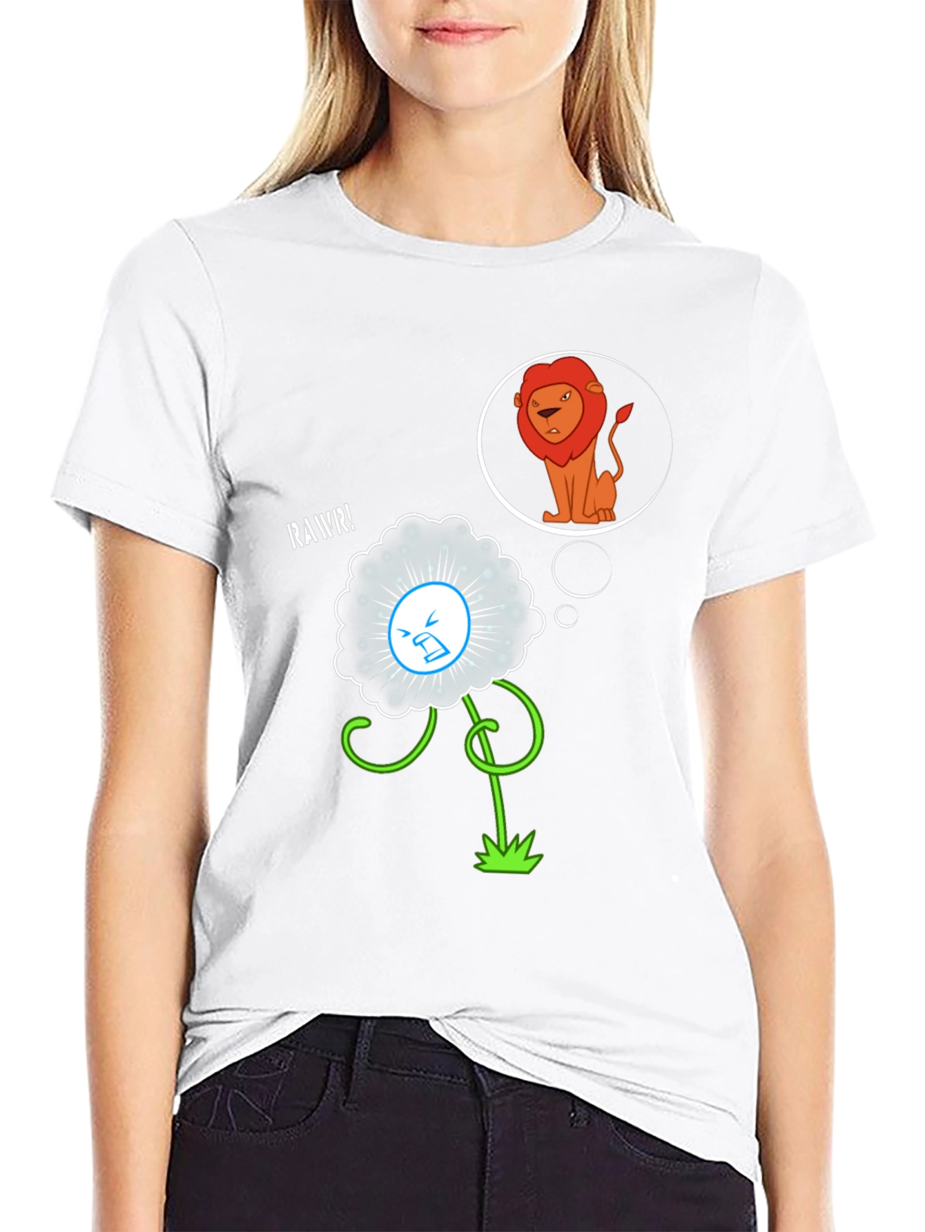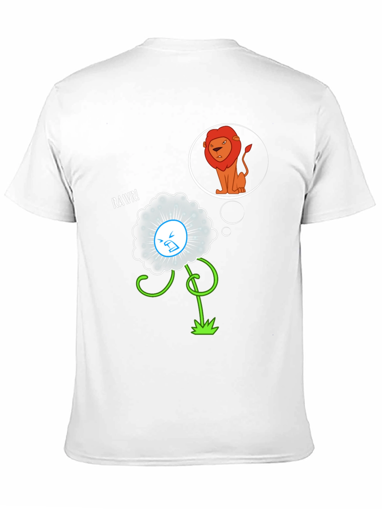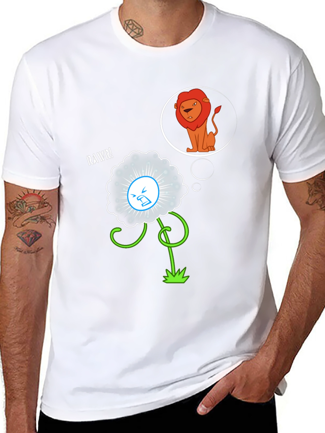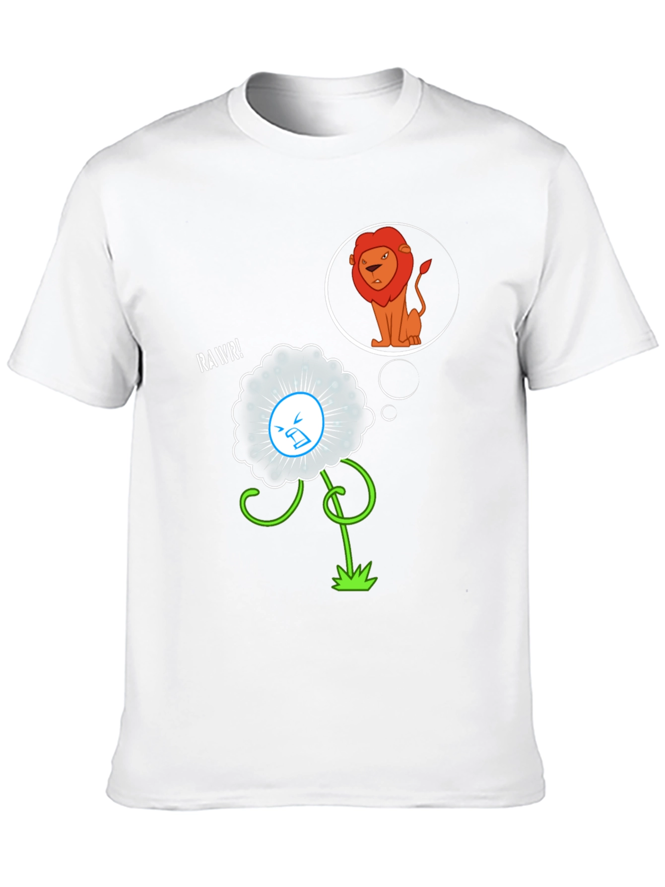 Roar into style with this unique black t-shirt! Featuring a playful design of a cute cartoon lion in a thought bubble above a peculiar angry cloud plant with 'RAWR!' text. The graphic is eye-catching and adds a fun, whimsical touch to your everyday wardrobe. Made from soft, comfortable fabric, this tee is perfect for casual wear. Show off your quirky personality and make a statement with this standout tee. Great for animal lovers and anyone who enjoys fun, unconventional designs. Stand out and spark conversations with this comfy and cool graphic tee.