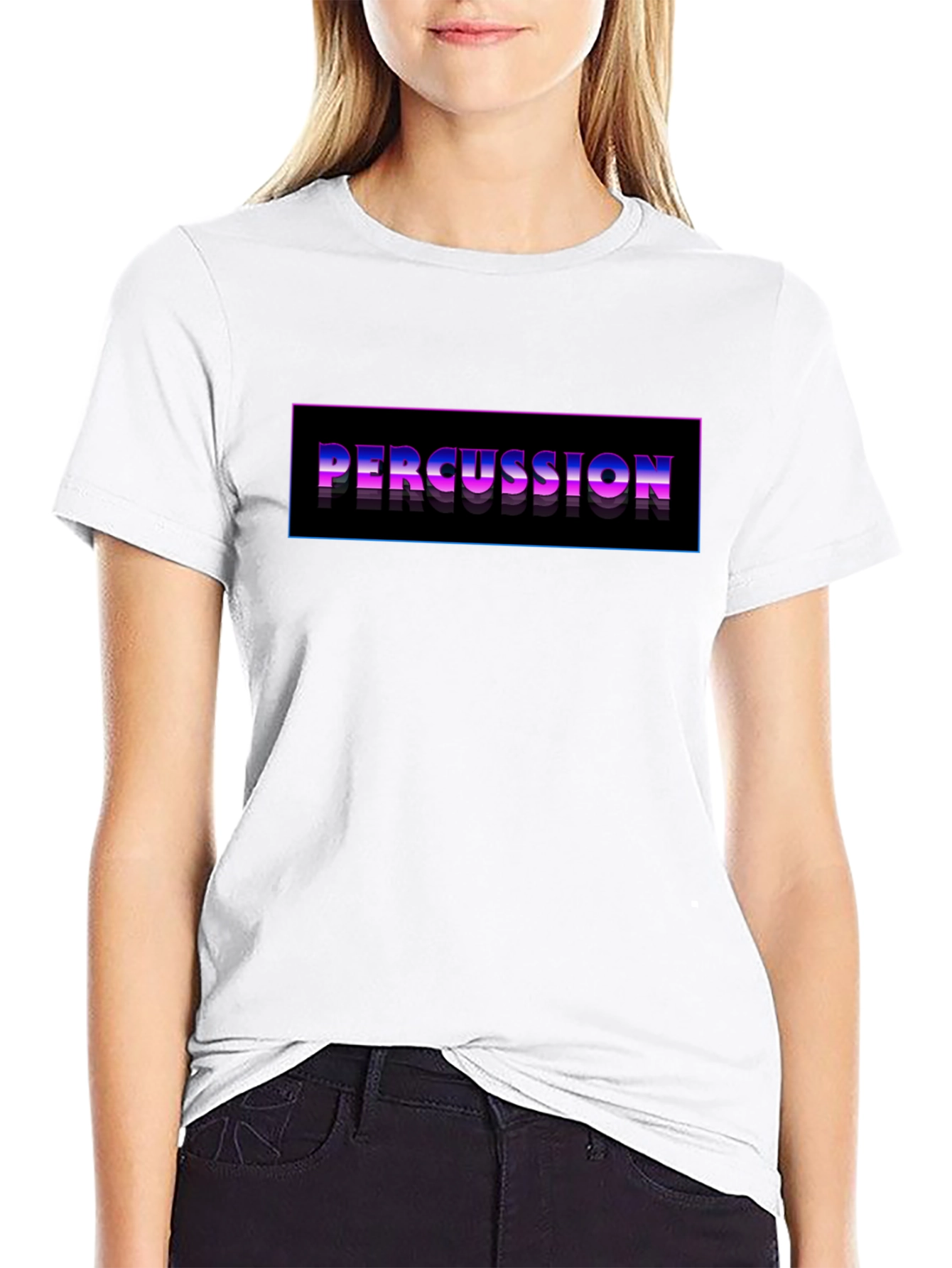 Show off your love of rhythm with this black t-shirt! This classic tee features the word 'PERCUSSION' in a vibrant, gradient graphic outlined with a modern border. The sleek design pops against the dark background. Made from soft, breathable fabric, this shirt offers all-day comfort and style. Perfect for musicians, music lovers, or anyone with a passion for percussion instruments! Dress it up or dress it down, this fun and unique shirt is sure to turn heads!