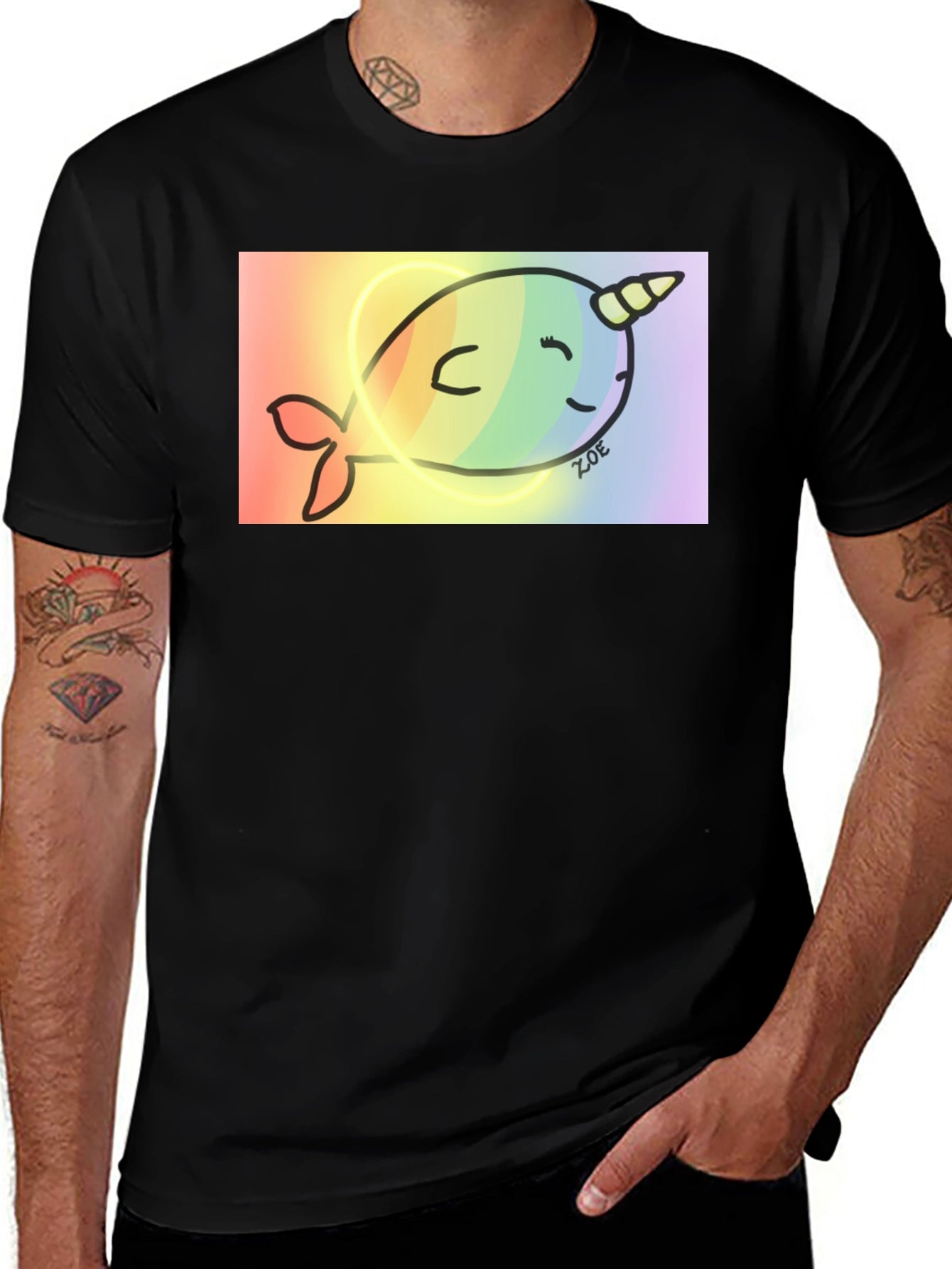 Express your unique style with this eye-catching black t-shirt featuring a vibrant rainbow narwhal graphic. The design showcases a cute narwhal illustration outlined in black, set against a bright rainbow-colored background. The tee appears to be made from a soft, comfortable cotton blend, perfect for everyday wear. The design suggests a fun, playful personality. Ideal for casual outings, lounging at home, or making a statement, this graphic tee is a must-have for anyone who loves unique and comfortable apparel.