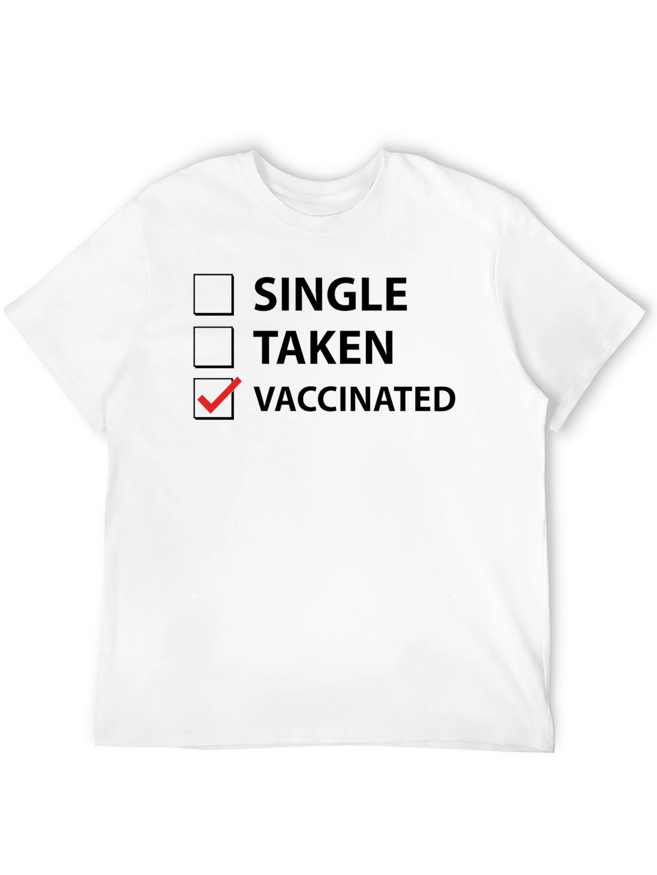 Show off your vaccination status with this humorous and stylish t-shirt. Made from a comfortable, dark-colored fabric, this tee features a playful "Single, Taken, Vaccinated" checkbox design. A red checkmark confidently marks the "Vaccinated" option, making a clear statement. This tee is perfect for casual wear, social gatherings, or as a conversation starter. The design is printed with high-quality ink for lasting vibrancy. Available in various sizes, this t-shirt is a fun and lighthearted way to express your views and stay comfortable. Get yours today and let the world know you're vaccinated!