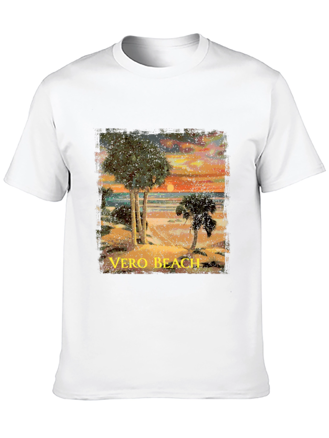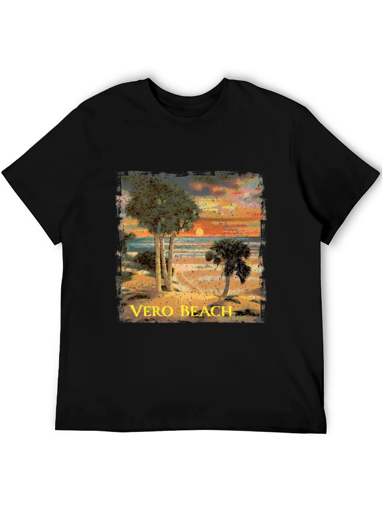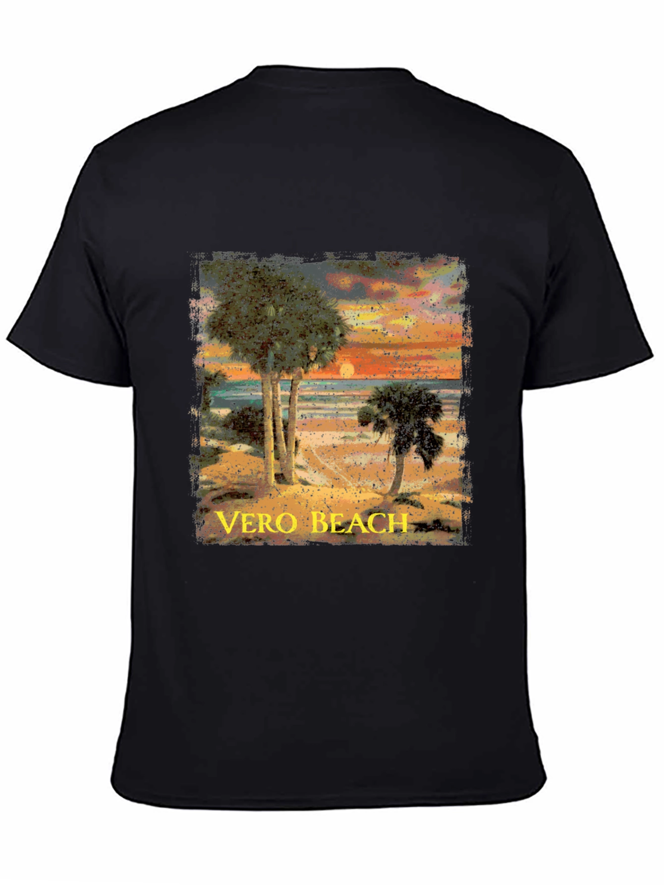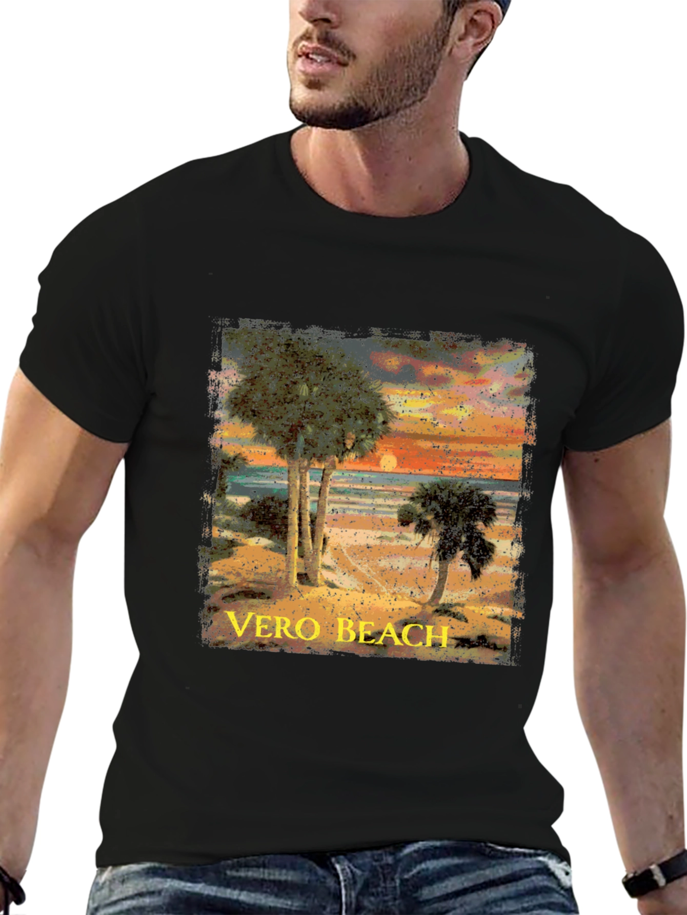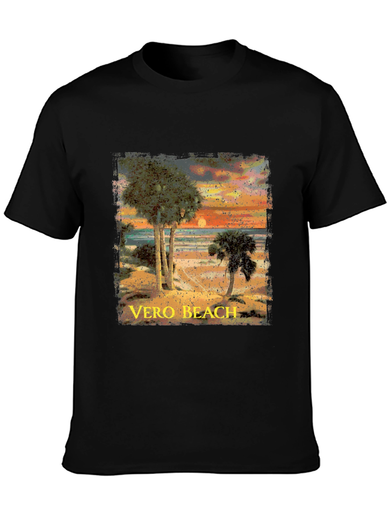Show off your love for Vero Beach with this stylish black t-shirt! Featuring a vibrant, square-framed graphic of a picturesque Vero Beach sunset scene, complete with palm trees and a shimmering ocean view. The "VERO BEACH" text is displayed prominently across the bottom of the graphic. Made from comfortable, breathable fabric, this tee is perfect for casual wear. Ideal for vacations, beach days, or simply displaying your Florida pride. This classic fit shirt offers ultimate comfort and style. Add a touch of coastal charm to your wardrobe today!